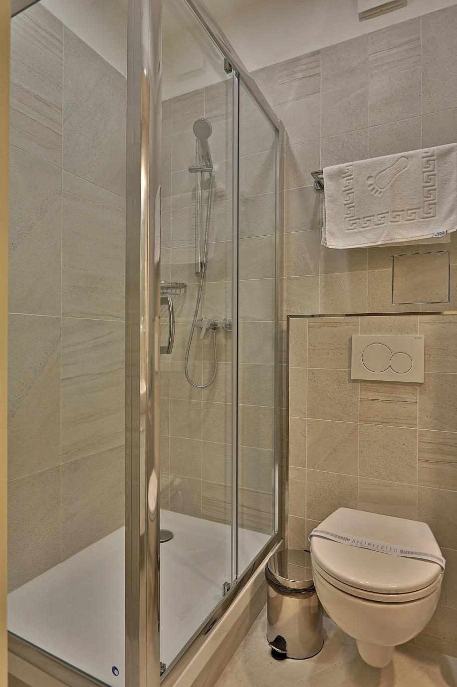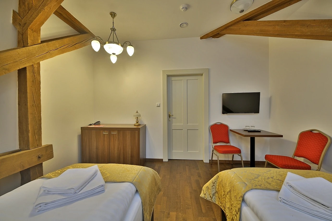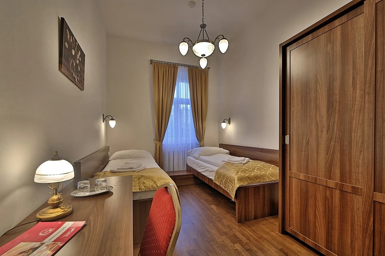 Televízor, telefón, trezor na recepcii, chladnička, WC, sprcha. Na každé lôžko - nočný stolík alebo polička s nočnou lampou, sklenený pohár, kreslo alebo stolička, v skrini 4 ks vešiakov, poduška a obliečka, prikrývka a obliečka, 1 osuška, 1 uterák, sklenený pohár, toaletné mydlo, vlasový šampón. Súčasťou vybavenia je otvárač na fľaše, hubka na čistenie obuvi.