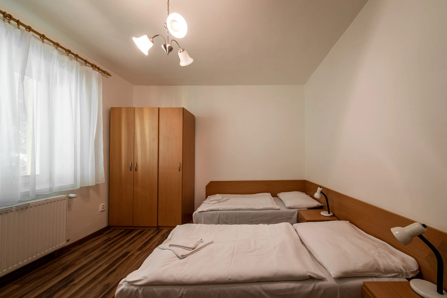 nezrekonštruované, obývacia a spálňová časť, kúpeľňa s vaňou + WC. Vybavenie: písací stolík, rozkladacia pohovka, televízor, telefón, sušič na vlasy, rýchlovarná kanvica, chladnička. Súčasťou apartmánu je sada tanierov, šálok, príbor a poháre (4ks). Na každé lôžko 1 osuška, 1 uterák, poduška a obliečka, prikrývka a obliečka, pohár, mydlo, vlasový šampón
