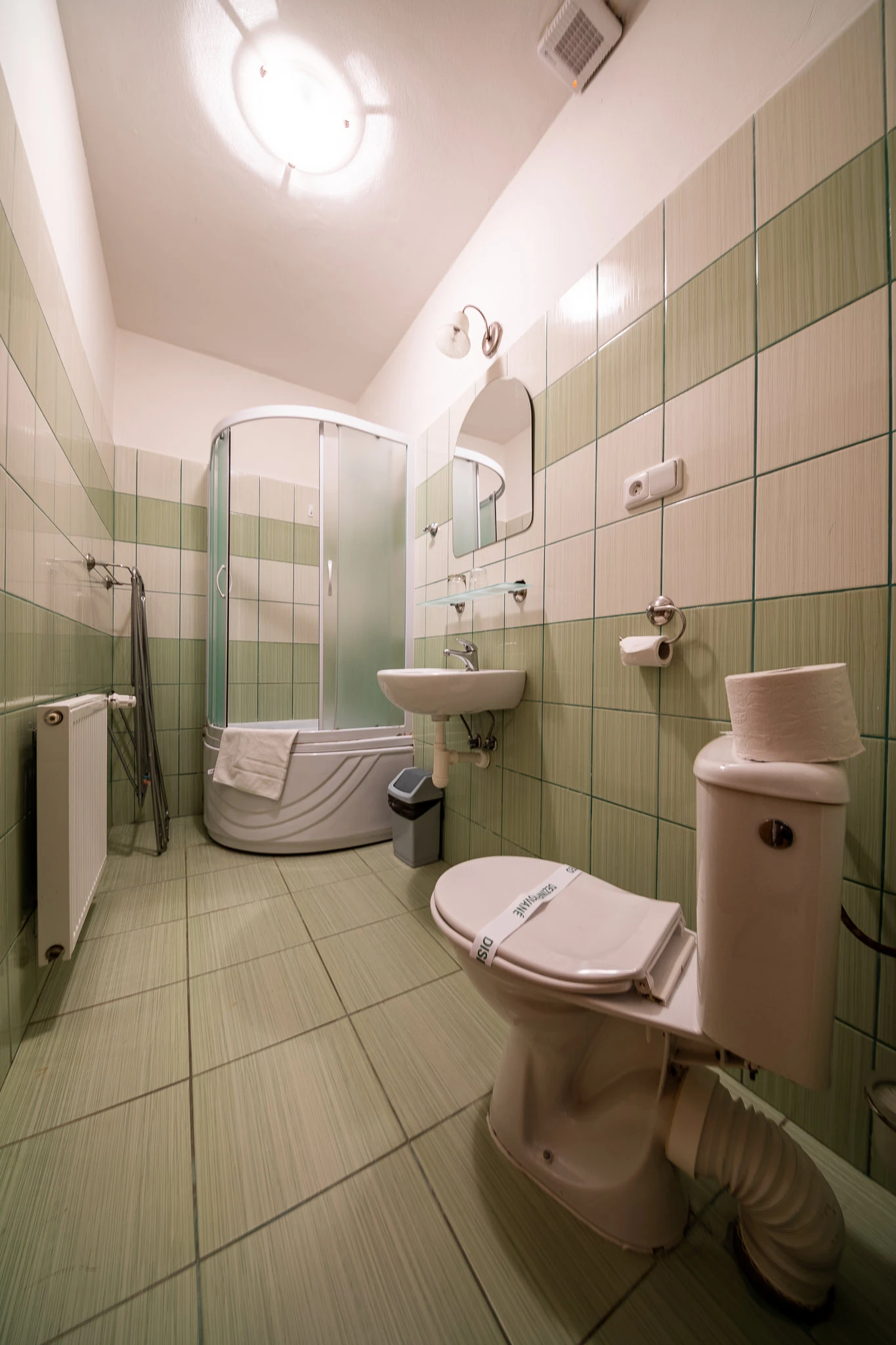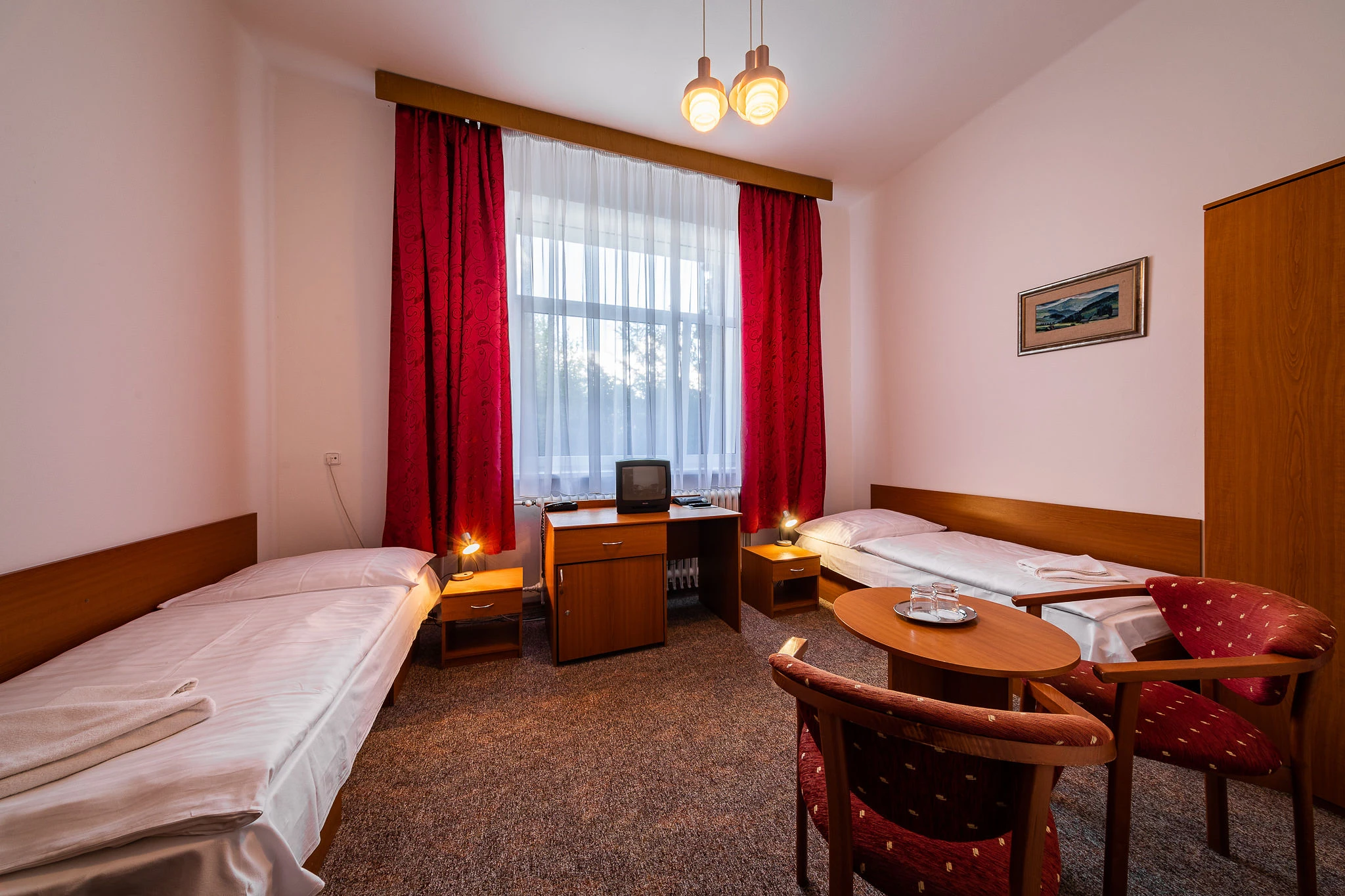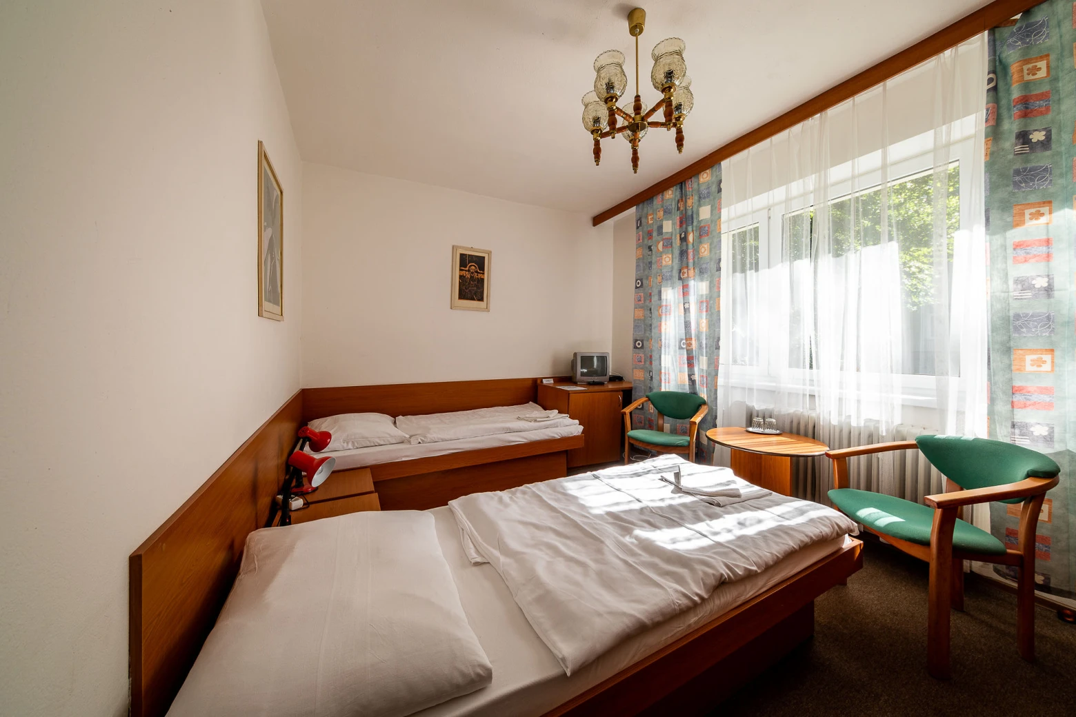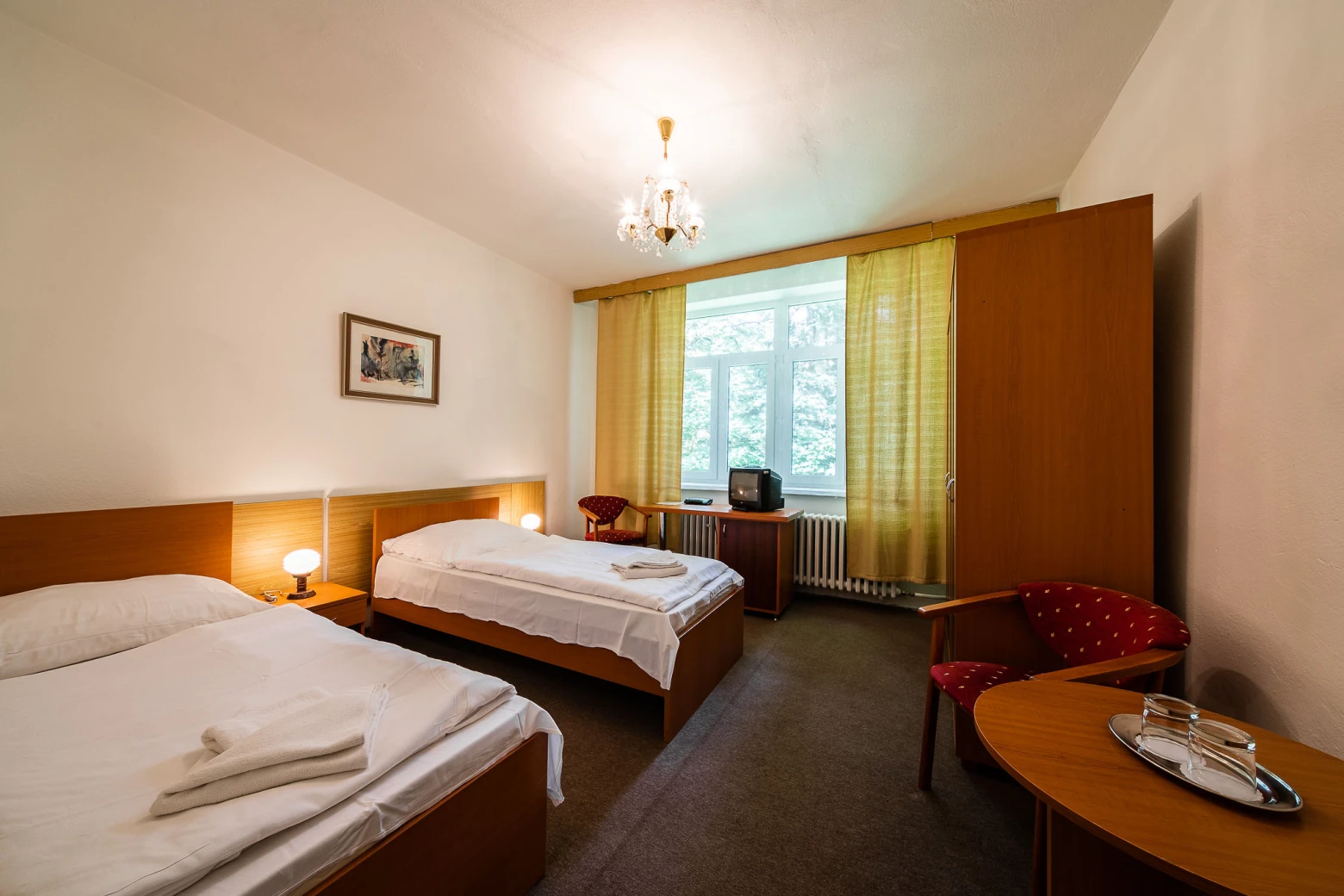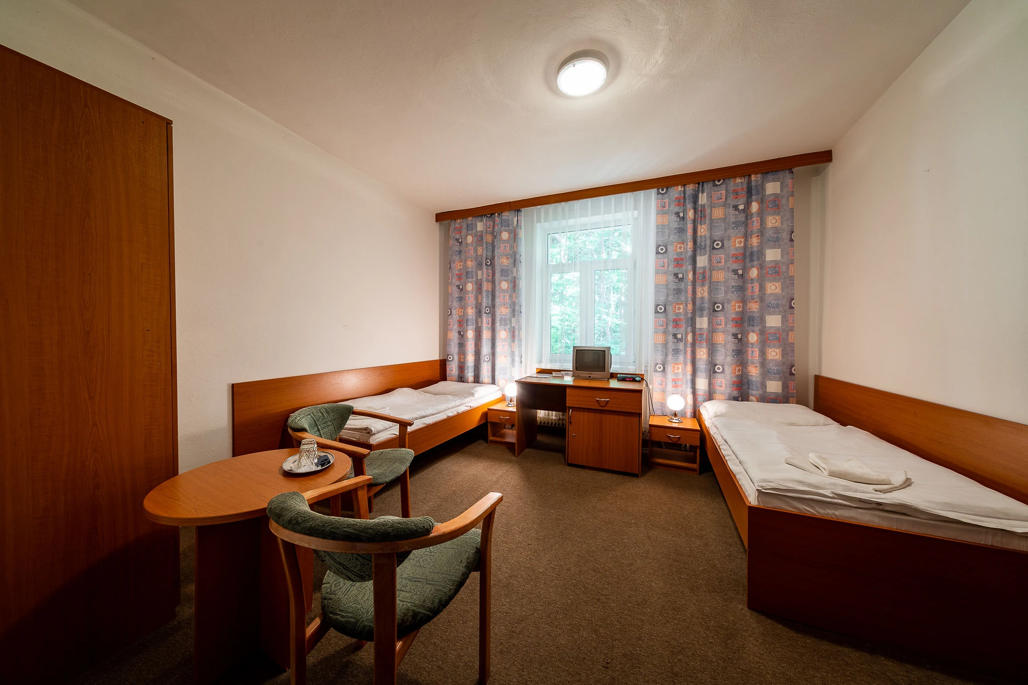 nezrekonštruované izby, televízor, telefón, WC, sprcha /vaňa. Na každé lôžko – pohár na vodu, stolička, poduška a obliečka, prikrývka a obliečka, 1 osuška, 1 uterák, vešiak, toaletné mydlo, vlasový šampón